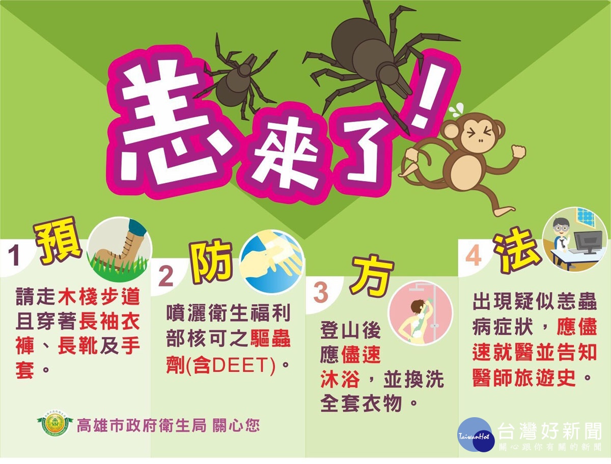 ▲高雄市政府卫生局制作恙虫预防宣导,教导民众如何远离恙虫。(图/高雄市政府卫生局提供)